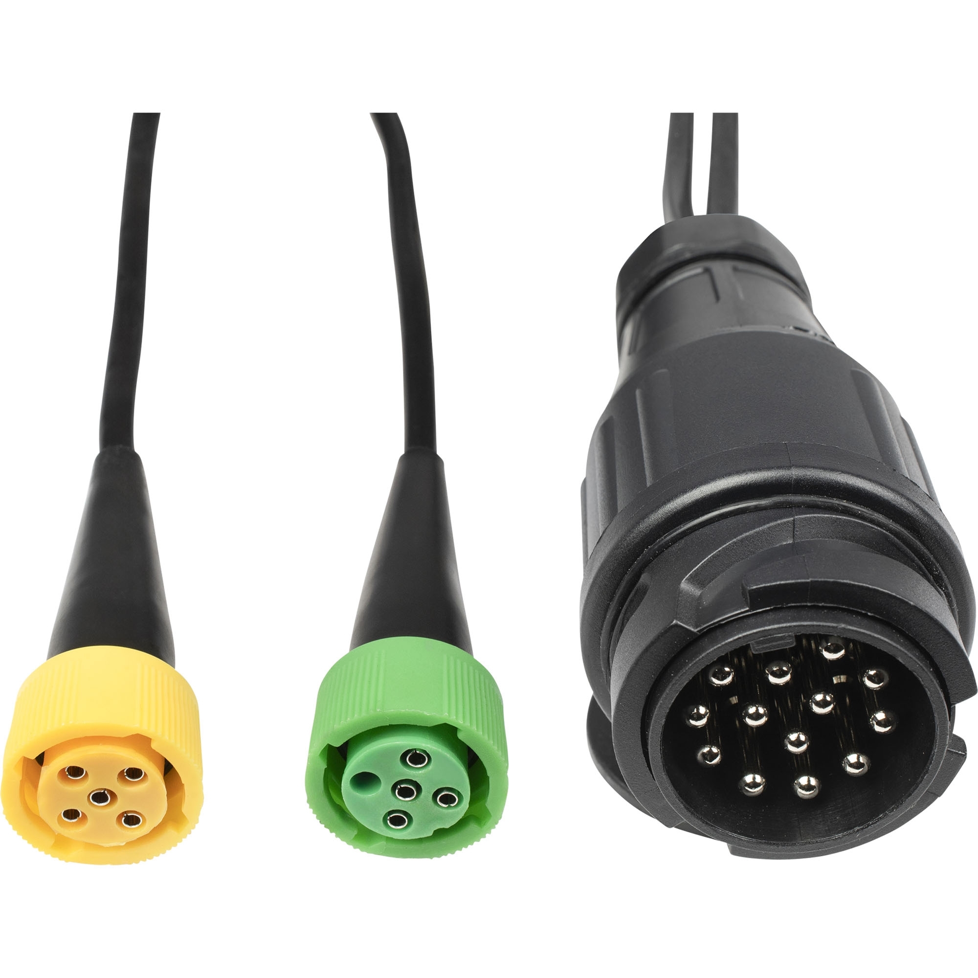 Câble d'alimentation 13 broches Compatible avec Aspöck et Jokon Connexion à baïonnette 5 broches Connecteurs jaune/gris = gauche, vert/blanc = droite Longueur du câble principal : 4000 mm