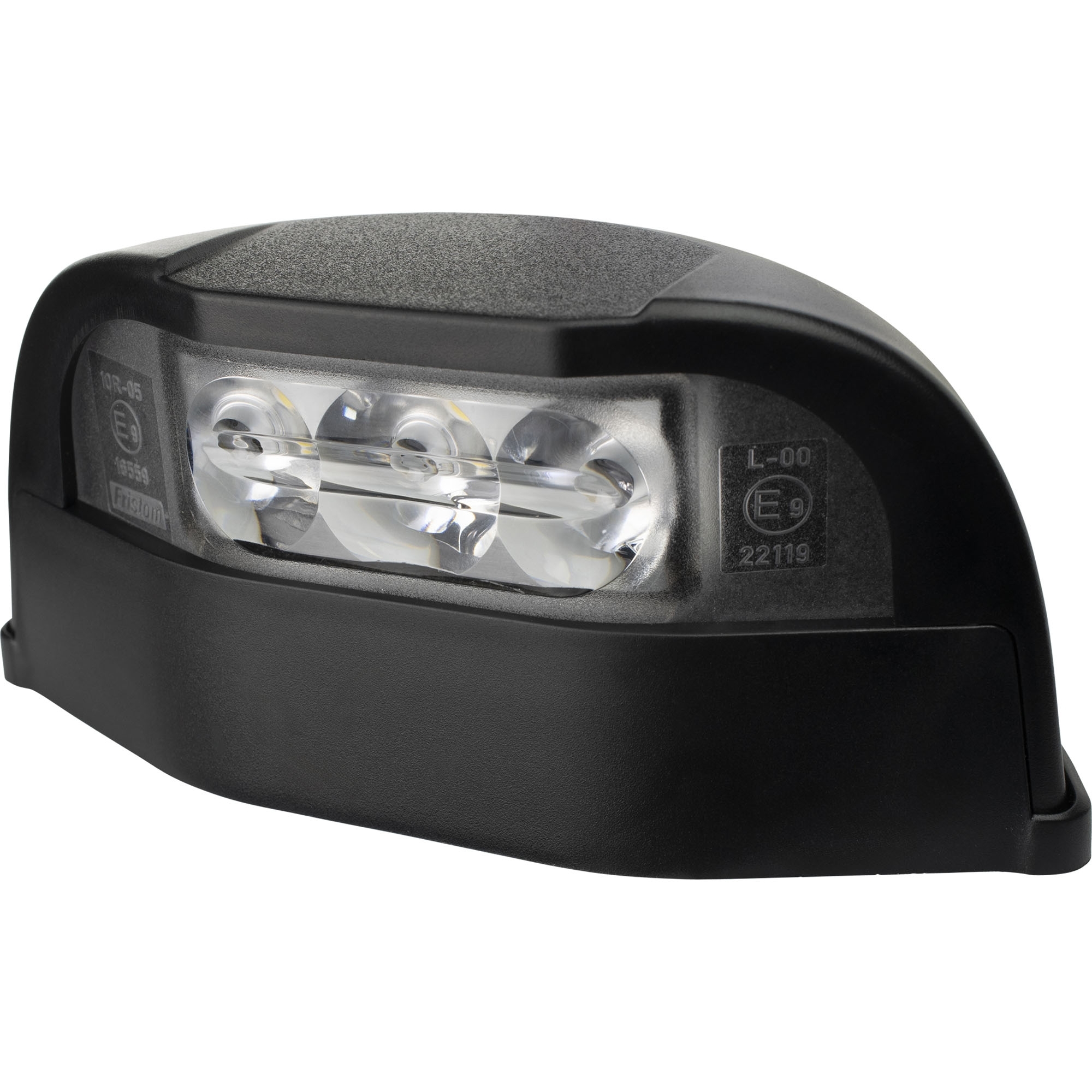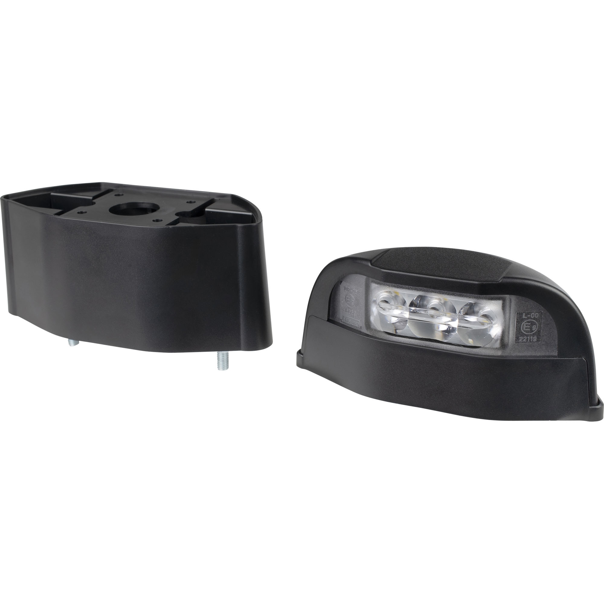 Feux d'immatriculation à LED à haut piédestal Câble de connexion Tension 12 – 30 V Puissance 1,5 W Largeur 120,3 mm Hauteur 97 mm Profondeur 57 mm Câble 500 mm Boîtier en plastique Écartement des trous de 71 mm Certification CEM, CEM, E9