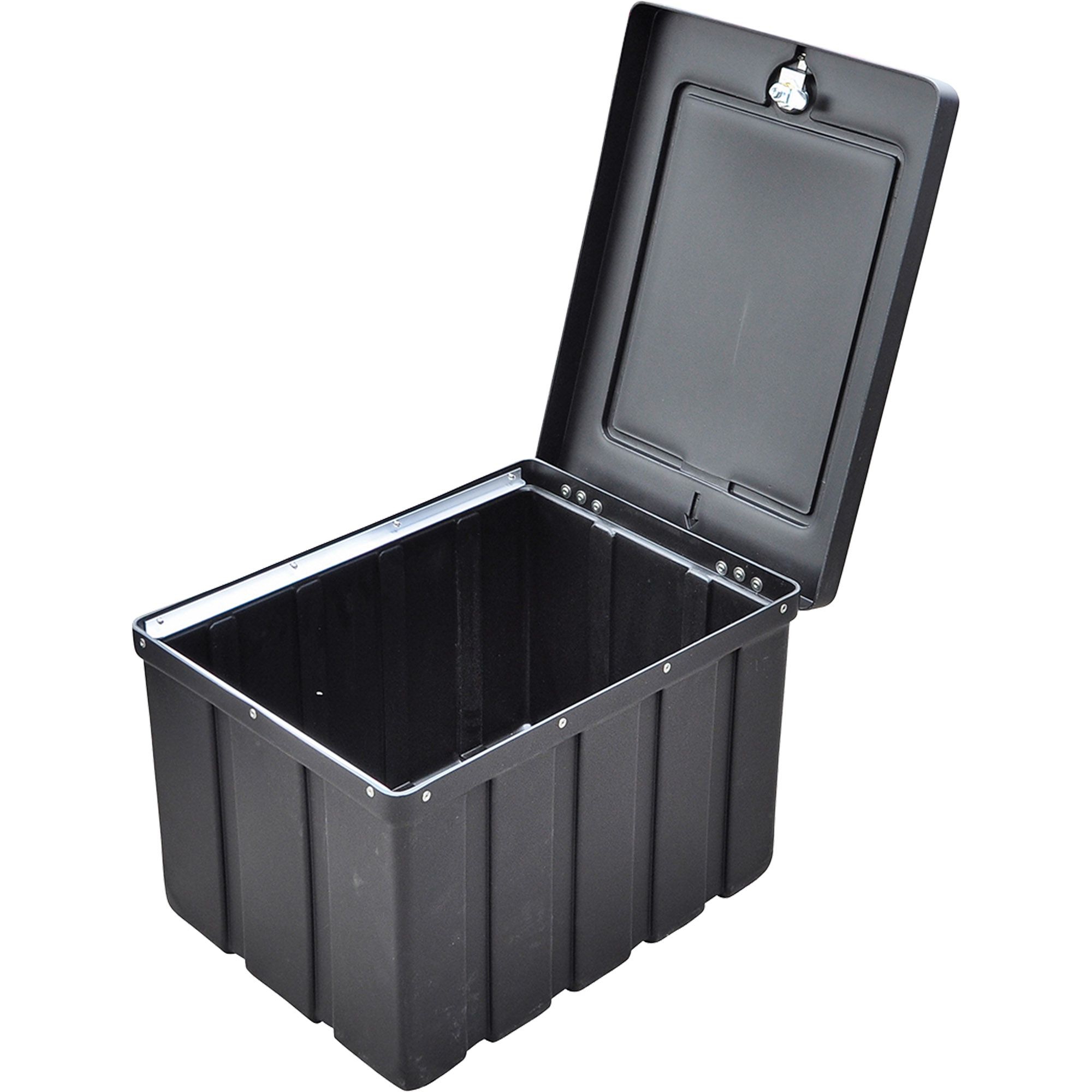 Coffre à outils Type R02 sans support Longueur 560 mm Largeur 430 mm Hauteur 360 mm Matériau en PVC Couleur noire avec couvercle rabattable Fermeture par verrou rotatif de sécurité incl. 2 clés en plastique (double panneton) Ferrures en V2A stable aux produits chimiques et aux UV résistant aux intempéries et aux variations de température éclaboussures protégé ABE 90442 EWG 89/27
