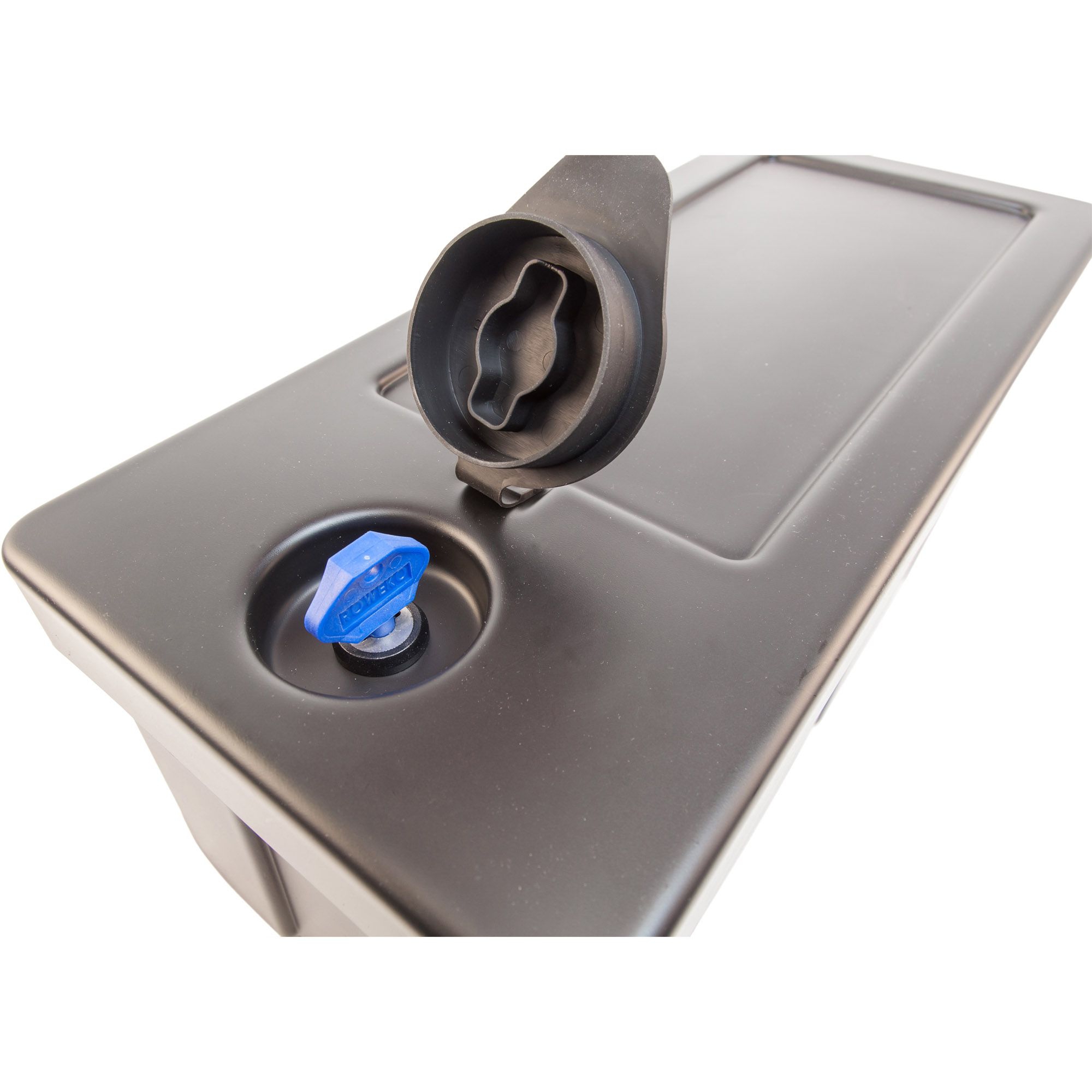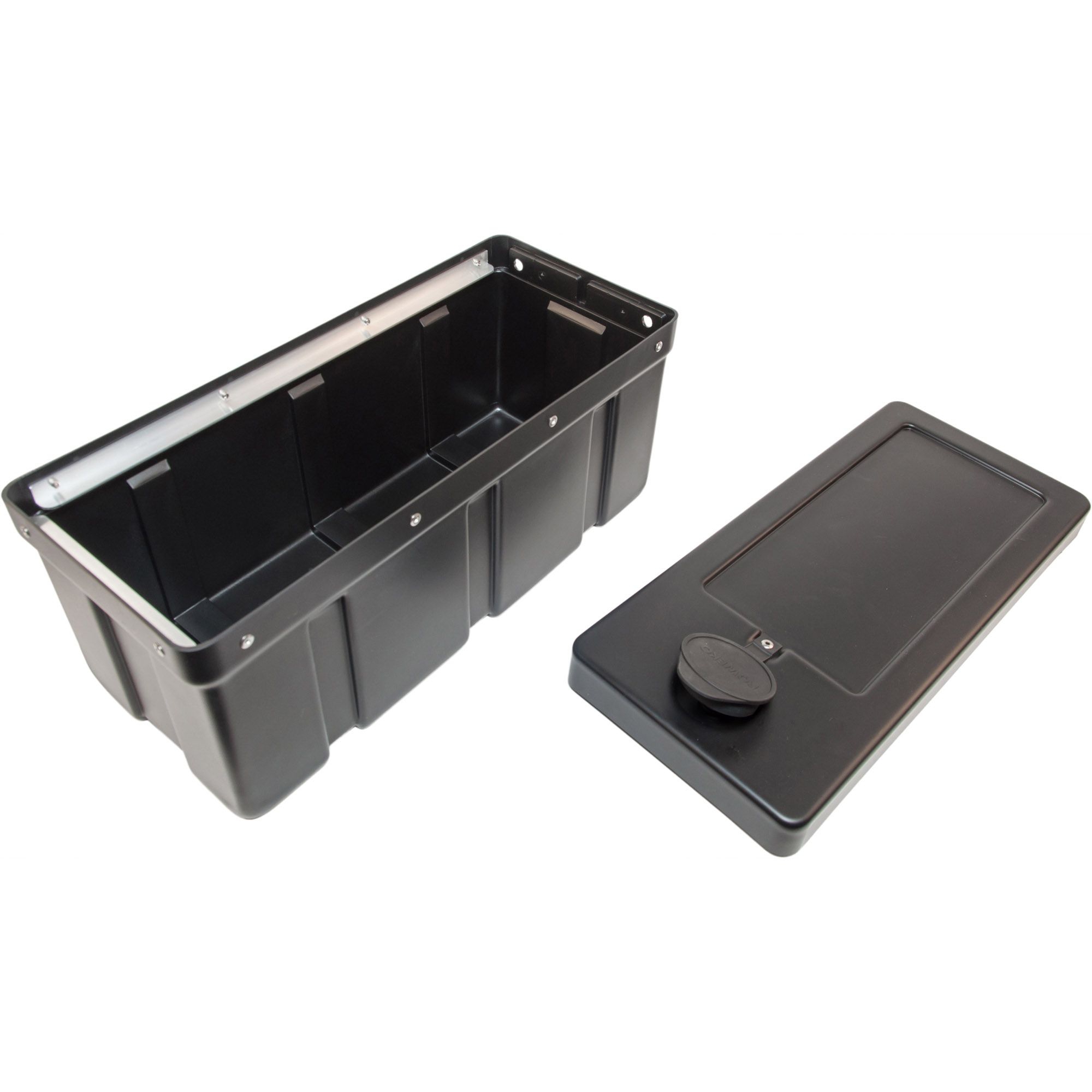 Coffre à outils Type R03 sans support Longueur 500 mm Largeur 220 mm Hauteur 205 mm Matériau en PVC Couleur noire avec couvercle amovible Fermeture par verrou rotatif de sécurité incl. 2 clés en plastique (double panneton) Ferrures en V2A stable aux produits chimiques et aux UV résistant aux intempéries et aux variations de température éclaboussures protégé ABE 90442 EWG 89/27