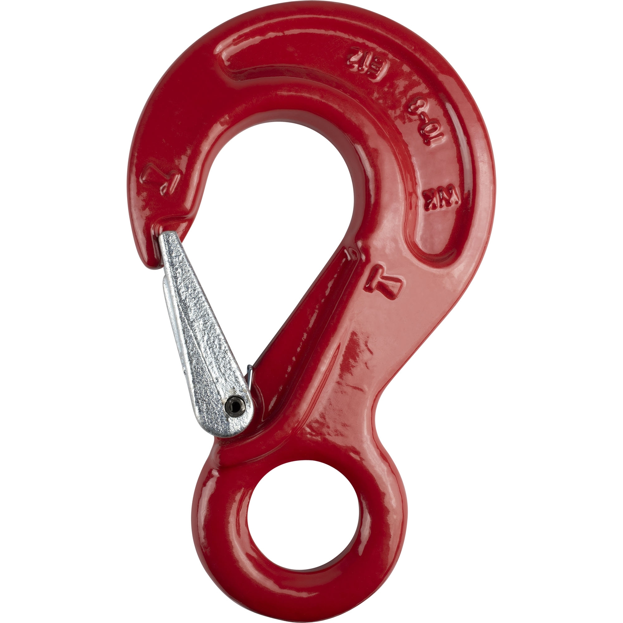 Crochet d'attelage avec une sécurité WLL 3150 kg Diamètre des yeux 34 mm Longueur 188 mm Largeur 112 mm Catégorie de qualité 8 DIN EN 1677-2 Couleur rouge