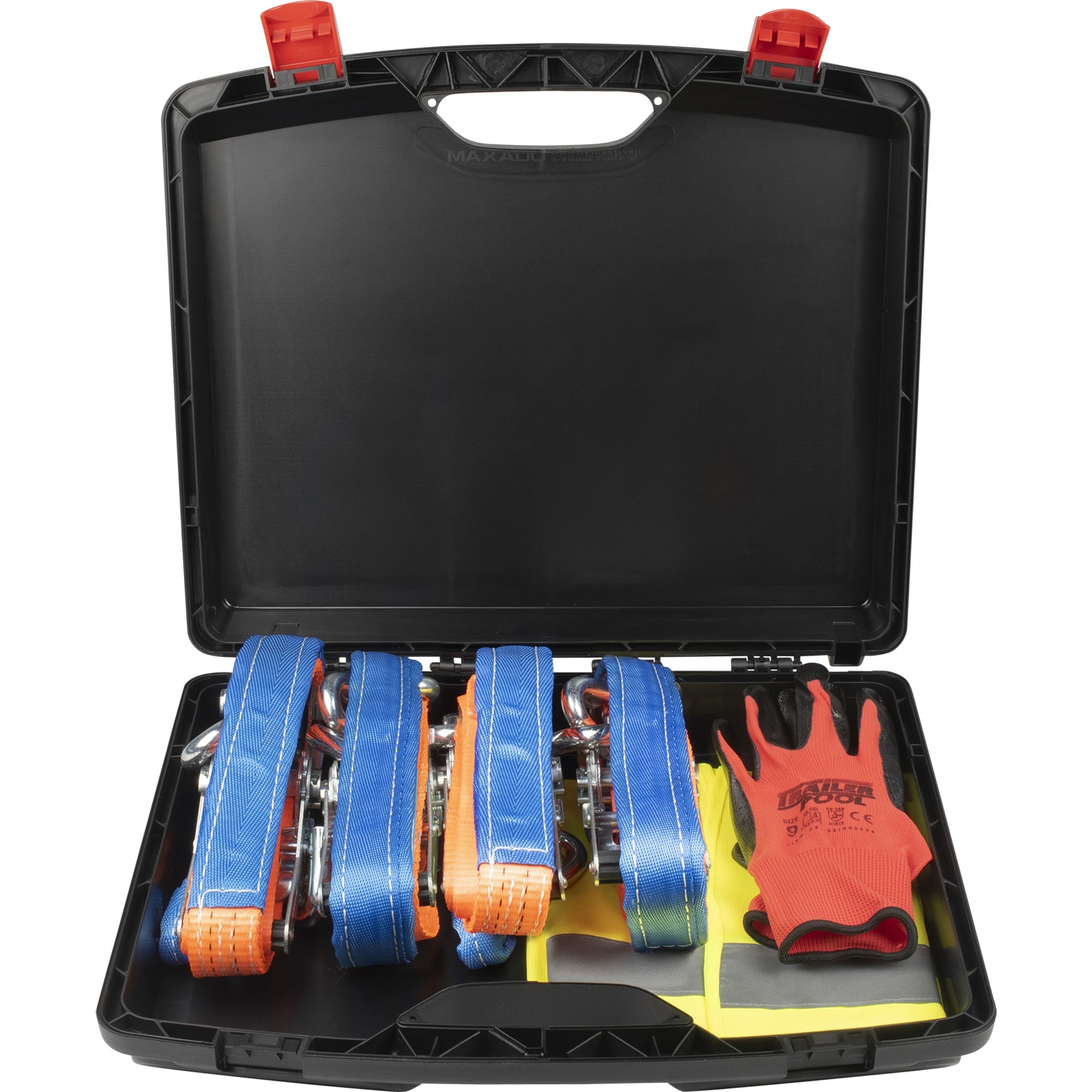 Kit de fixation véhicule comprenant: 4 x sangles monopièce réf. 013000222 Largeur 35 mm, capacité 1000 daN Couleur orange Cliquet à poignée courte (Lg 110 mm) et crochet simple Sangle longueur 1500mm avec manchon de protection 1 x gilet de sécurité, jaune fermeture velcro Norm EN20471 1 paire de gants de travail taille 9 Matériau support Polyester, revêtement nitrile, couleur rouge/noir Emballés dans une valisette PVC noir Dimensions 422 x 366 x 107 mm