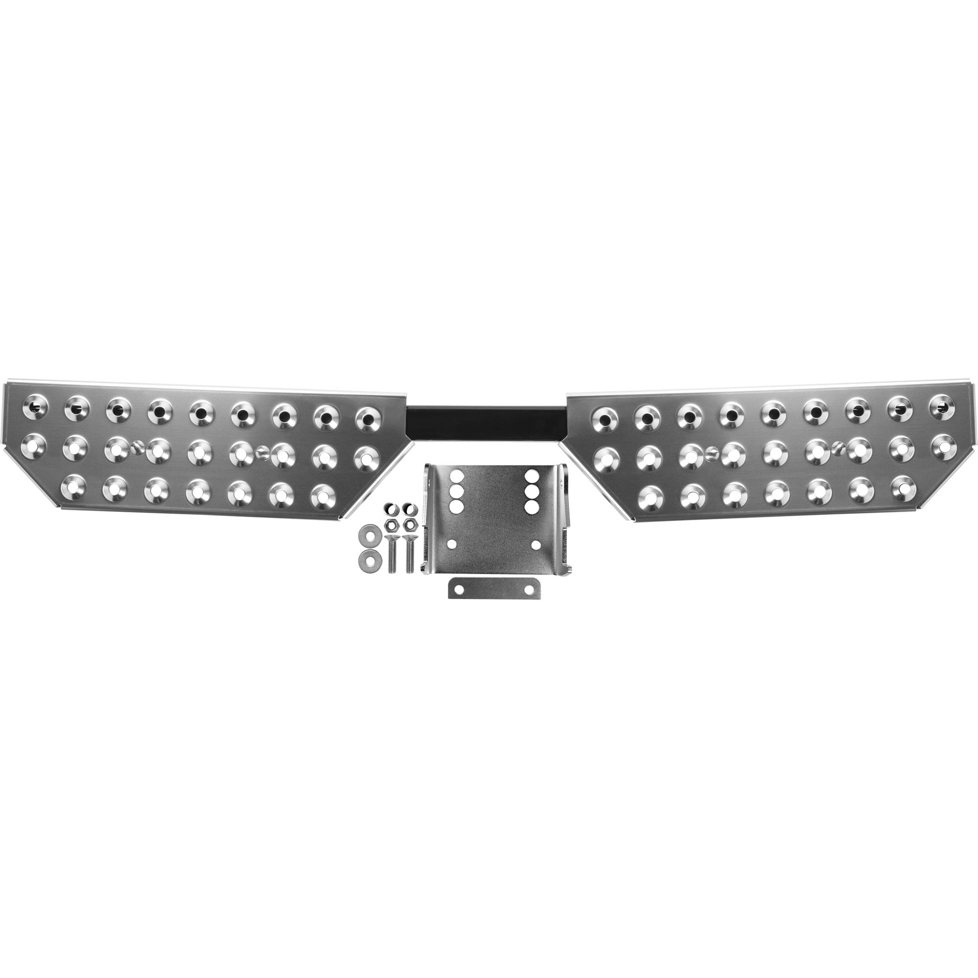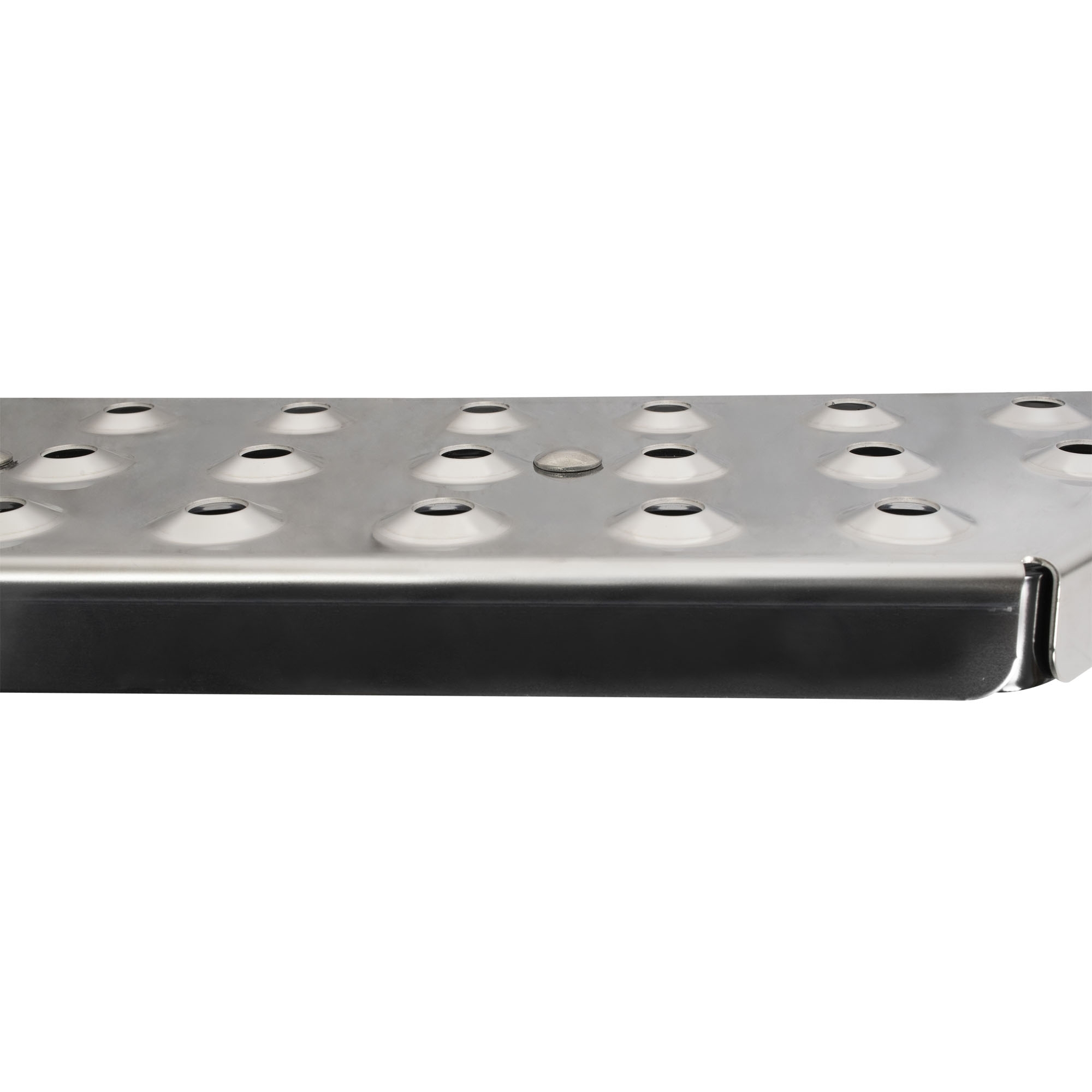 Marche-pieds pour crochet d'attelage Tôle perforée anti-dérapante en INOX Largeur totale 1140 mm Dimensions demi marche 460 x 150 mm Capacité 150 kg Pour véhicule avec crochet d'attelage 2 ou 4 vissé sur la traverse de l'attelage. Montage facile et rapide Platine d'adaptation, 4 trous inclue