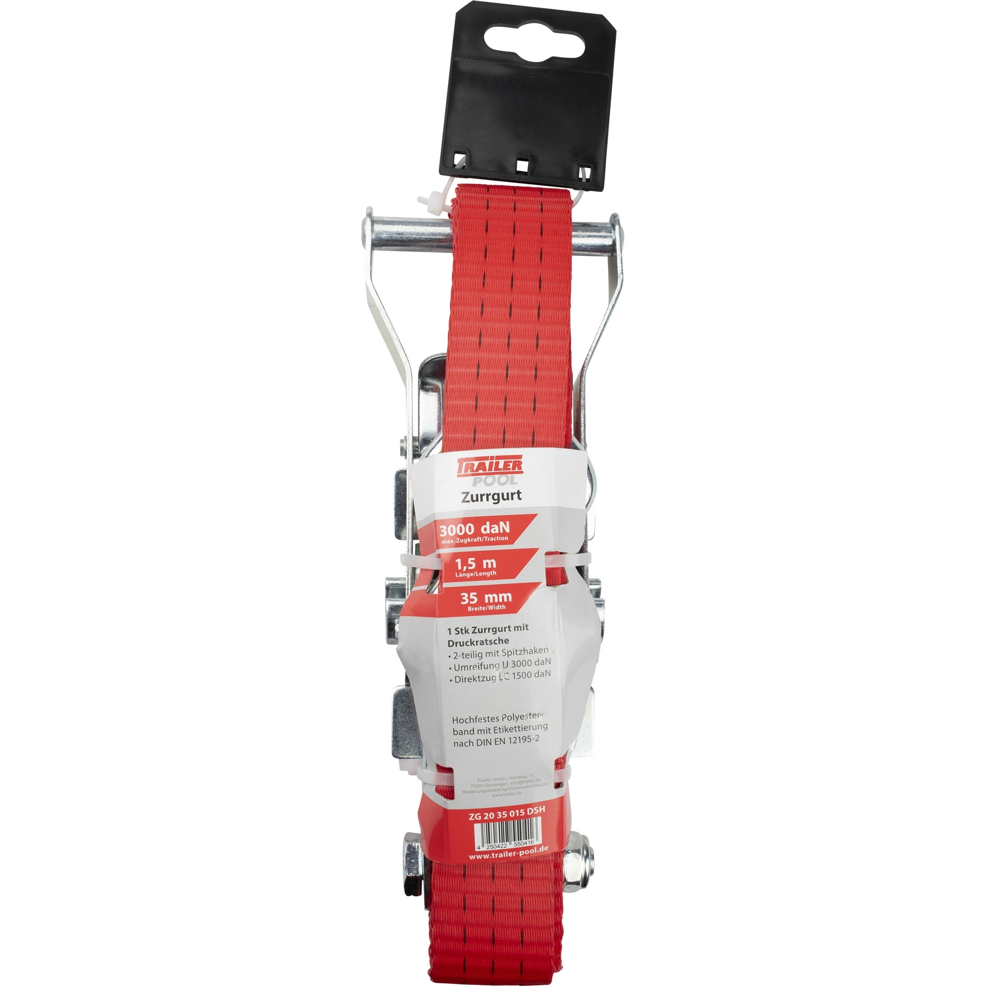 Sangle avec crémaillère pression 2-pce. avec crochet aigu Longueur 1500 mm Largeur 35 mm U 3000 daN LC 1500 daN Couleur rouge Fabriqué selon DIN EN 12195-2