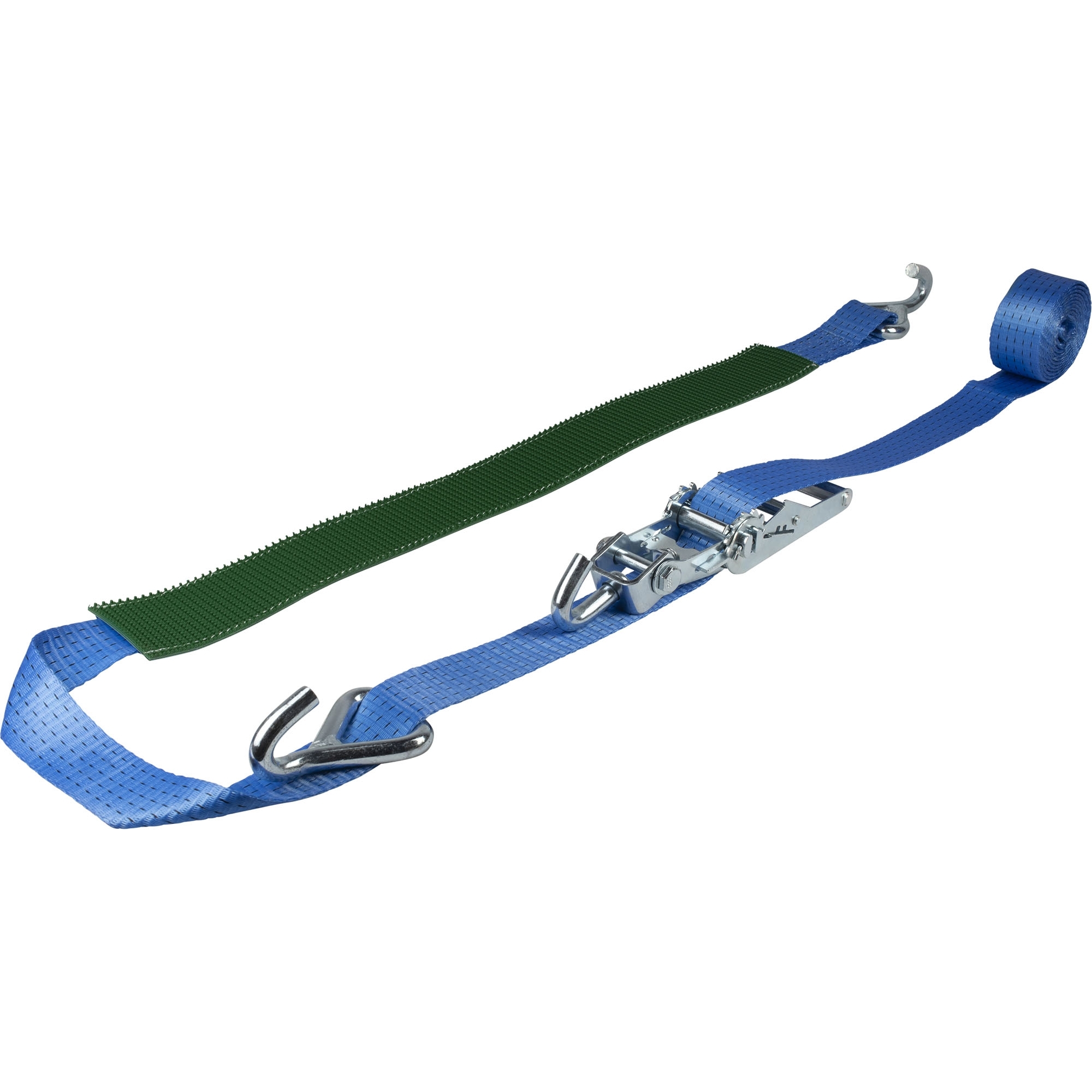 Sécurité de roue, 1 pièce pour les pneus à partir de 19" Longueur totale 4500 mm Largeur 50 mm LC 2500 daN Couleur bleu est composé de Râcleuse à pression avec crochet tournant Bande de sangle avec 2 crochets à pointes en forme de triangle et bande antidérapante