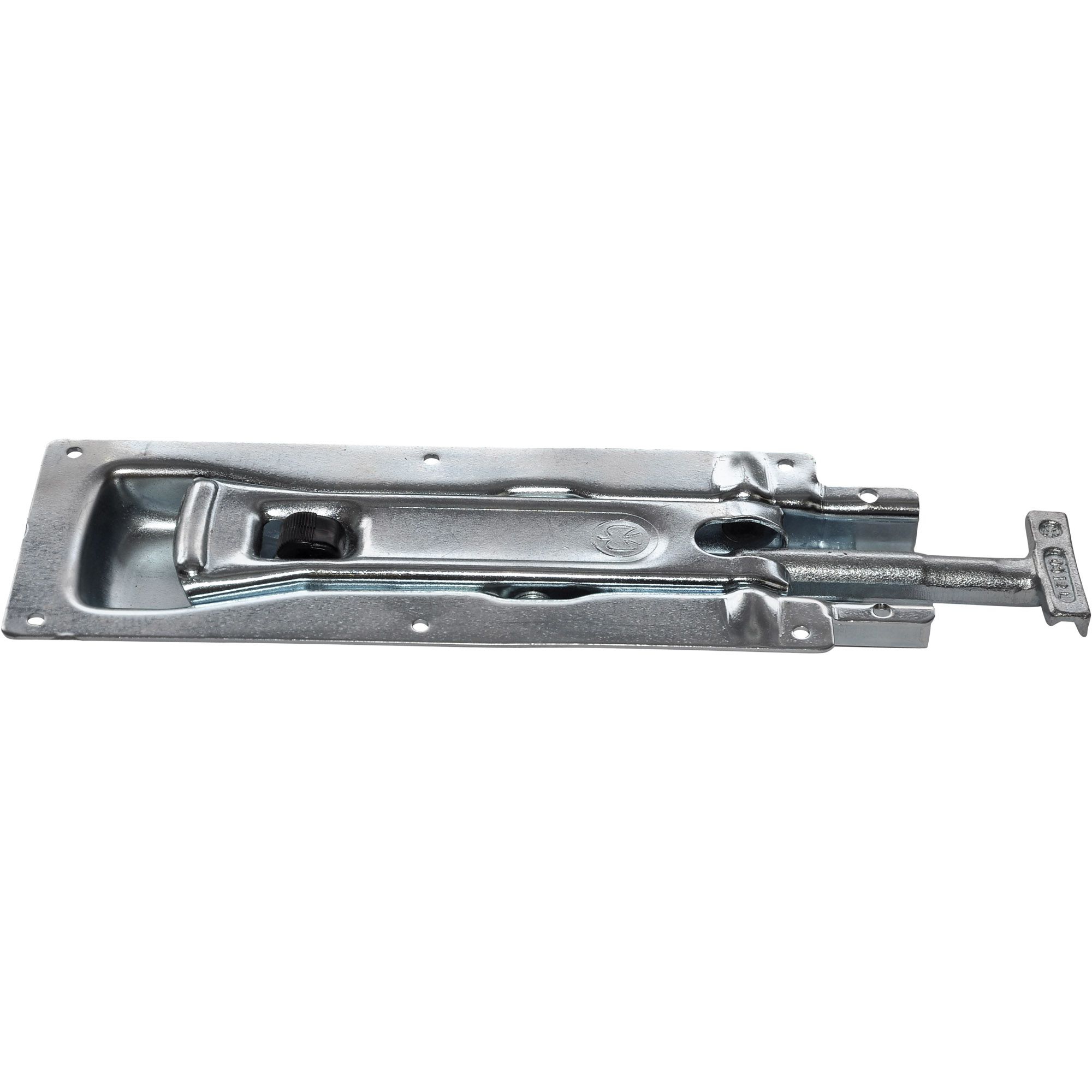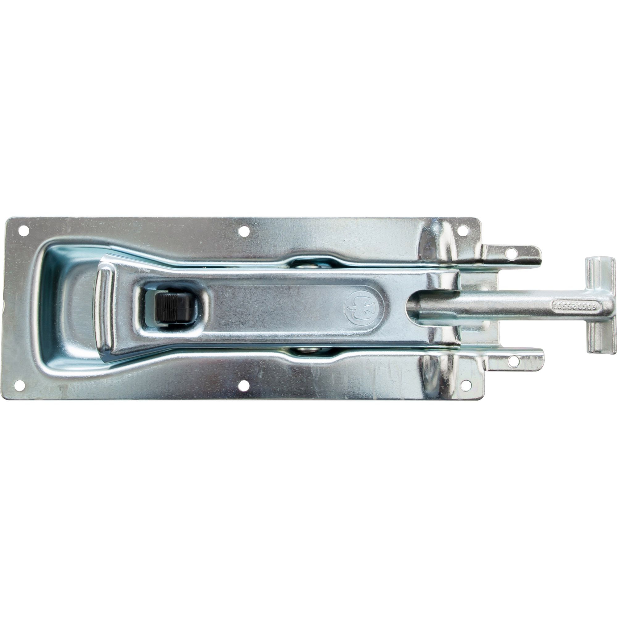 Serrure à loquet intégré type HESTAL acier zingué Longueur totale 338 mm, Epaisseur environ 22 mm, Entraxe trous de fixation 230 x 80 mm, Trous diam. 5,0 mm