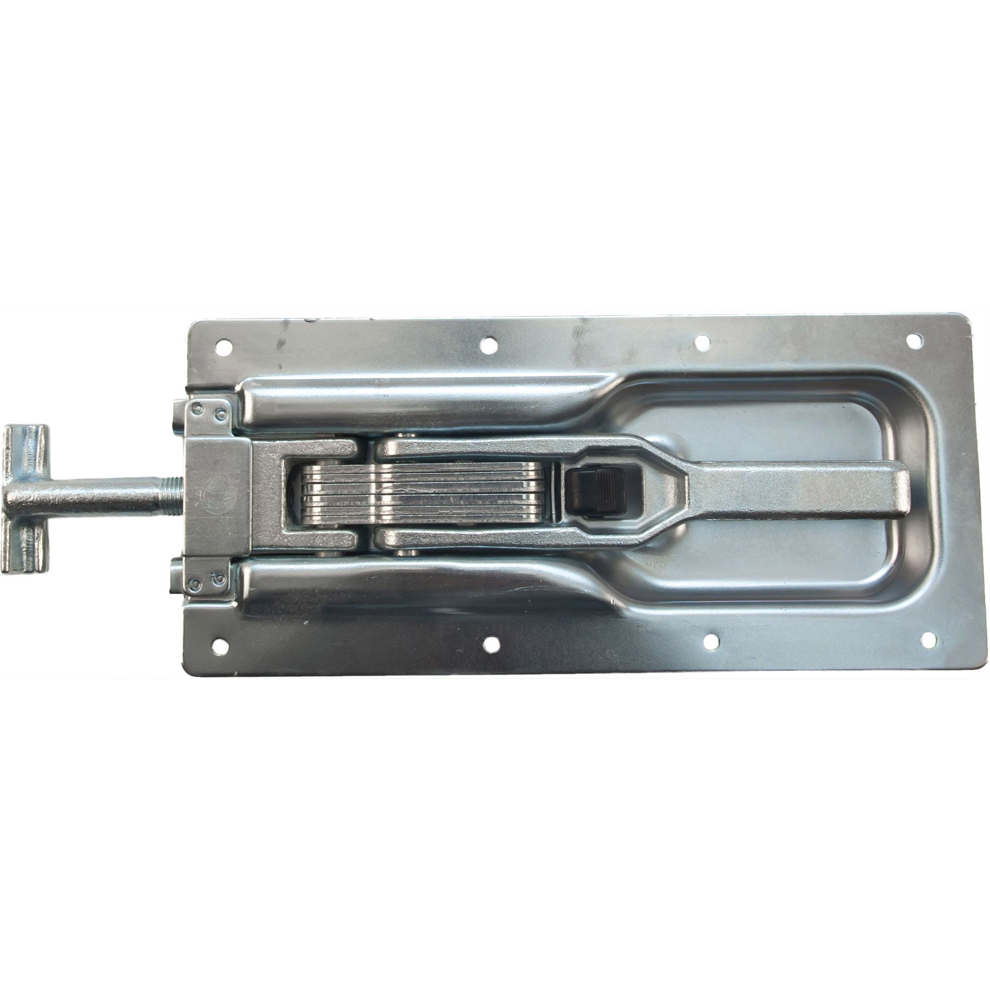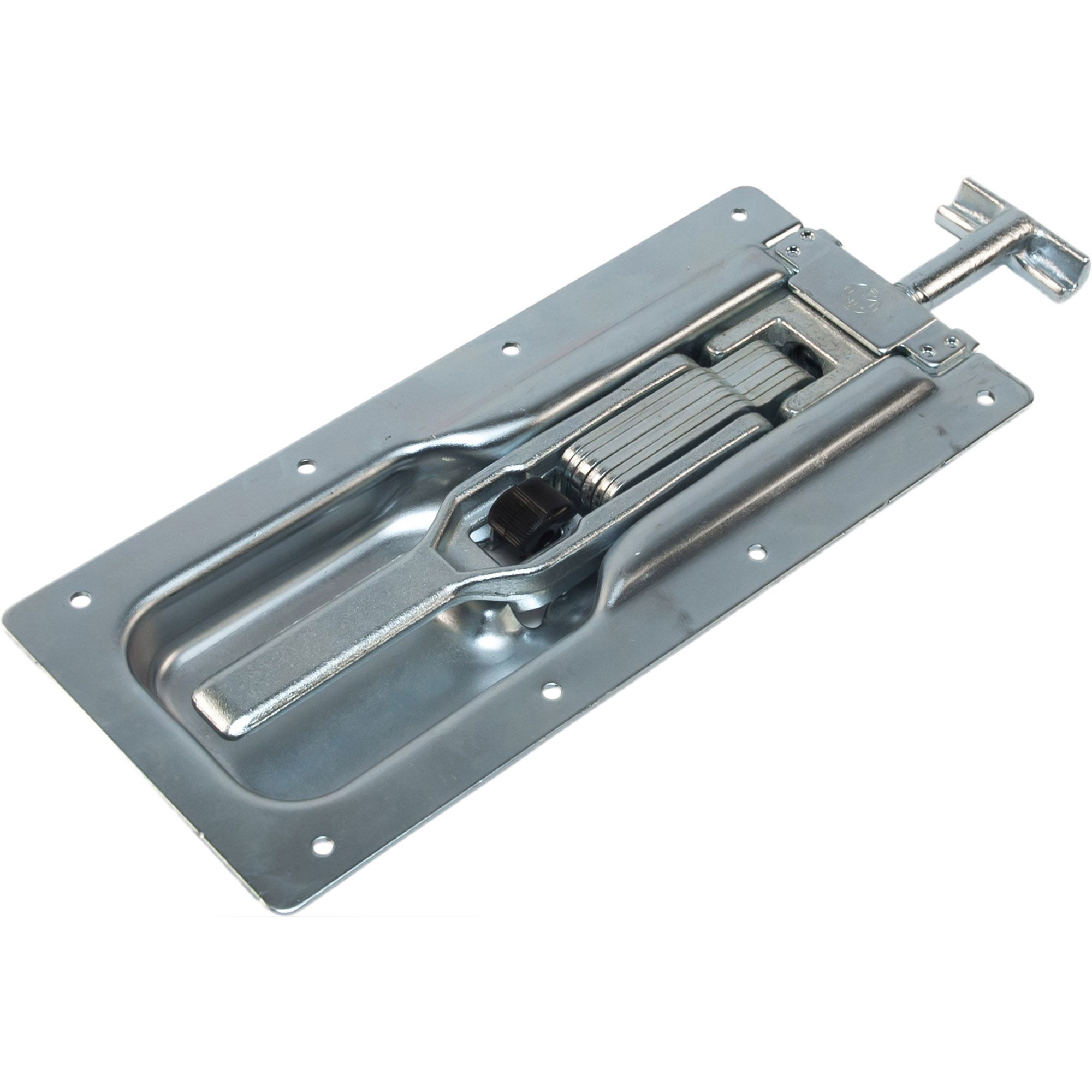 Serrure à loquet intégré type HESTAL acier zingué Longueur totale 335 mm, Epaisseur environ 25 mm, Entraxe trous de fixation 235 x 100 mm, Trous diam. 5,0 mm