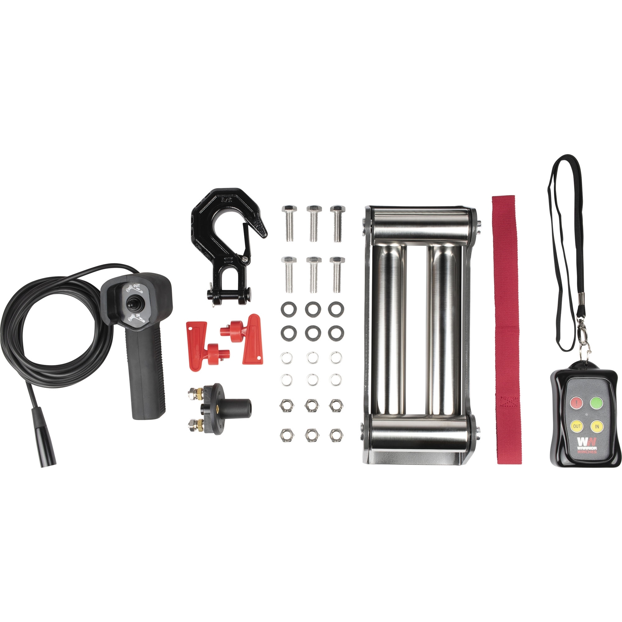 Treuil électrique Max. Force de traction 3628 kg Vitesse 10,2 m / min Démultiplication 196:1 Tension 12 volts Consommation électrique 358 A Ø-câble 8,3 mm Longueur câble 29 m Tambour (Ø x L) 63 x 223 mm Mesure 559 x 160 x 248 mm Plaque de montage 254 x 114,3 mm Contenu: Embrayage à roue libre, frein automatique Câble télècommande Télécommande à radio Câble de rouleau Câble en acier avec crochet Vis de fixation en acier inoxydable Consigne de sécurité: Le treuil n'est pas destiné au levage de charge, sécurité de charge et transport de personnes.