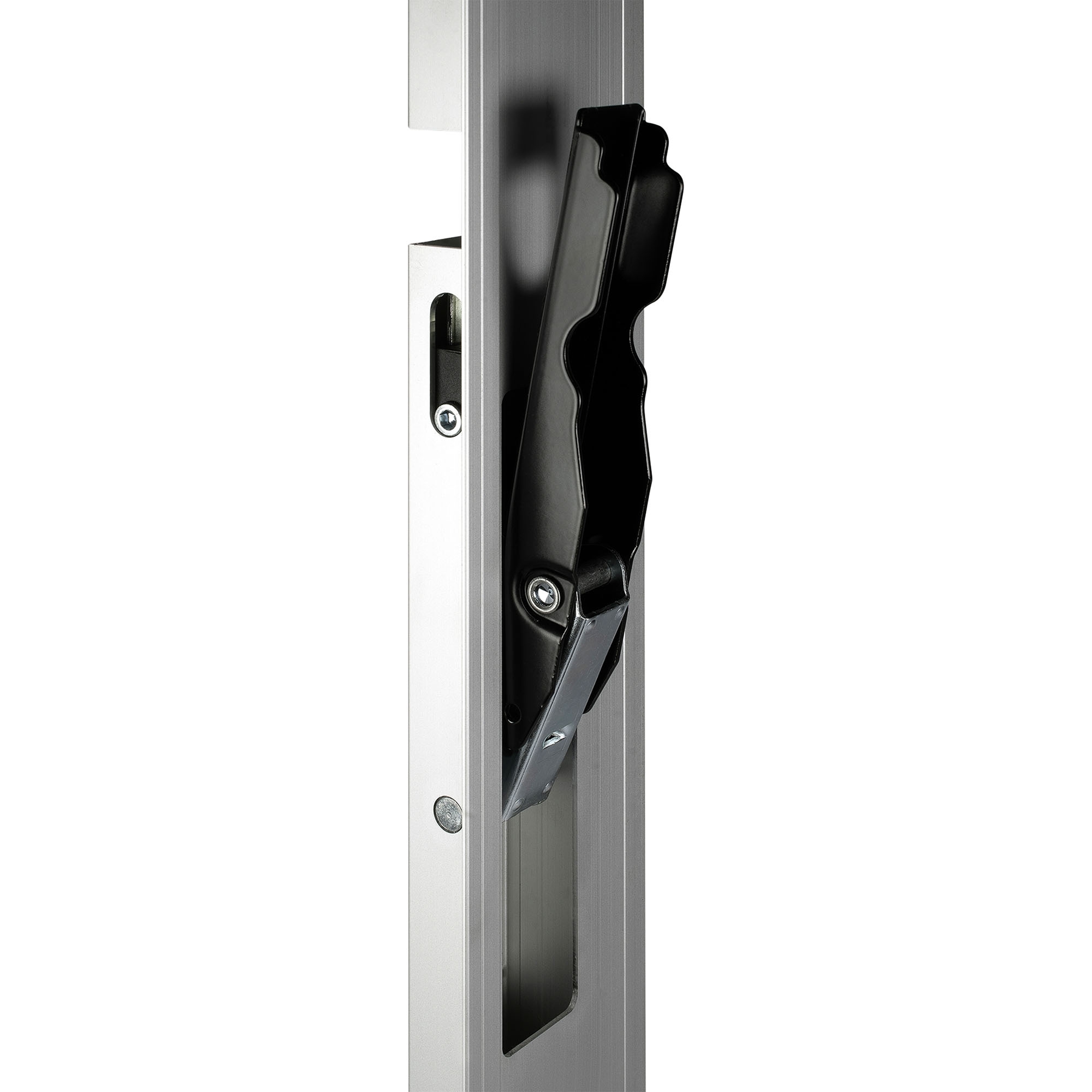 fermeture à levier encastré, coté gauche, pour ridelle aluminium H. 800 mm ép. 25mm Poignée acier noir peinte par poudrage Verrou acier zingué , Avec butée et avec capuchon PVC noir